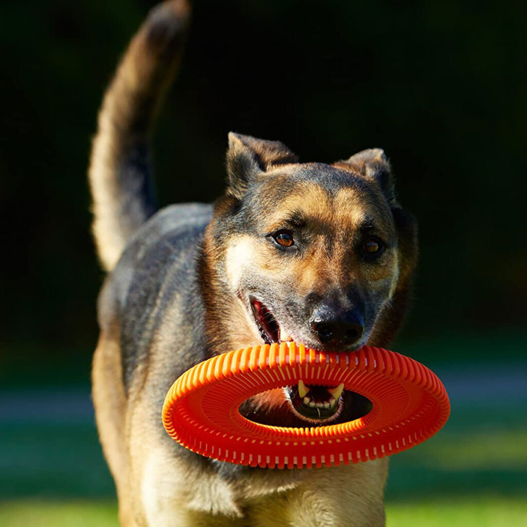 Robusten frizbi je zasnovan za grobo igro in vzdržljive pse. Polipropilensko jedro zagotavlja trpežnost in trdnost, grebeni pa omogočajo, da zobje psa oprimejo igračo, ne da bi jo prebodli. Rugged Flyer plava na vodi in je dobro viden zahvaljujoč svetli barvi. Posebna struktura omogoča, da ga psi zlahka poberejo s tal.