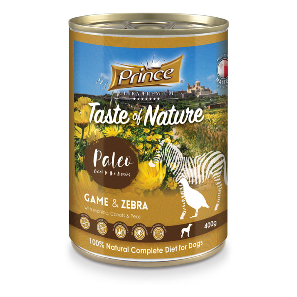 Hrana za pse Prince PALEO je popolna in uravnotežena mokra hrana za odrasle pse vseh pasem s slastno divjačino in zebro ter dodatkom korenja in olivnega olja. Svežina in polnost okusa ter sama tekstura hrane prepriča tudi tiste najbolj izbirčne. Dopolnilna hrana je lahko prebavljiva in vsebuje le naravne sestavine, brez gensko spremenjenih organizmov in umetnih dodatkov. Odlična izbira za vse, ki želijo za svojega psa le najboljše!